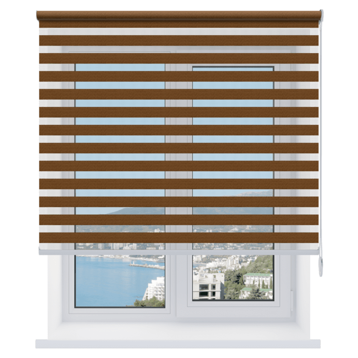 Открытые рулонные шторы «день-ночь» – солнцезащитные системы, состоящие из полотна (состоит из двух слоев ткани с прозрачными и непрозрачными полосами), которое при подъеме наматывается на вал без короба. Такие модели рольштор стоят дешевле закрытых, но ткань на валу остается открытой и не защищена от пыли.